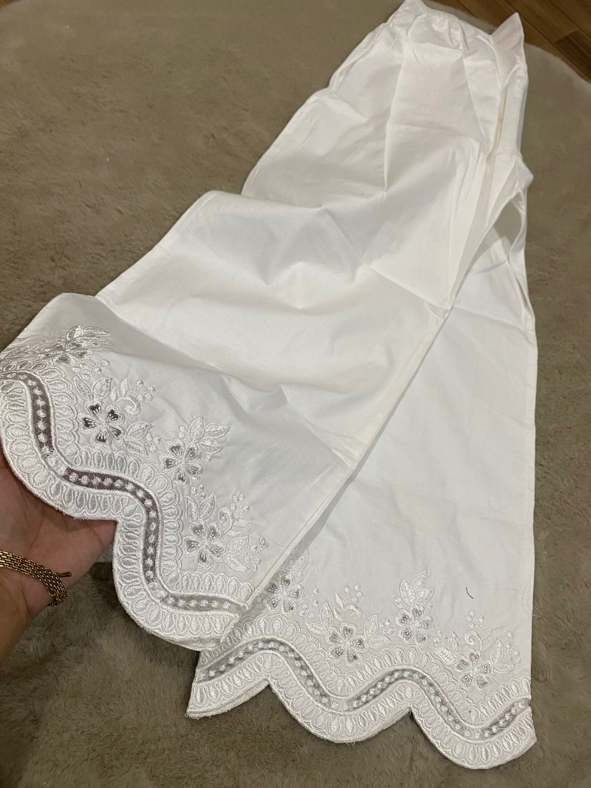White Chikankari Embroidered Culottes – Scalloped Lace Hem