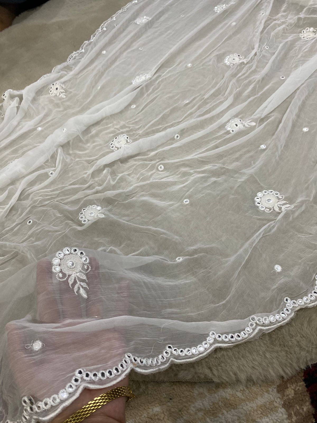 Elegant Pure Chiffon Dupatta featuring delicate gold tilla embroidery with foil detailing. The dupatta has beautifully scattered butti motifs and a finely crafted scalloped border that adds a luxurious traditional touch. Made from soft, lightweight chiffon, it drapes gracefully and enhances any outfit.