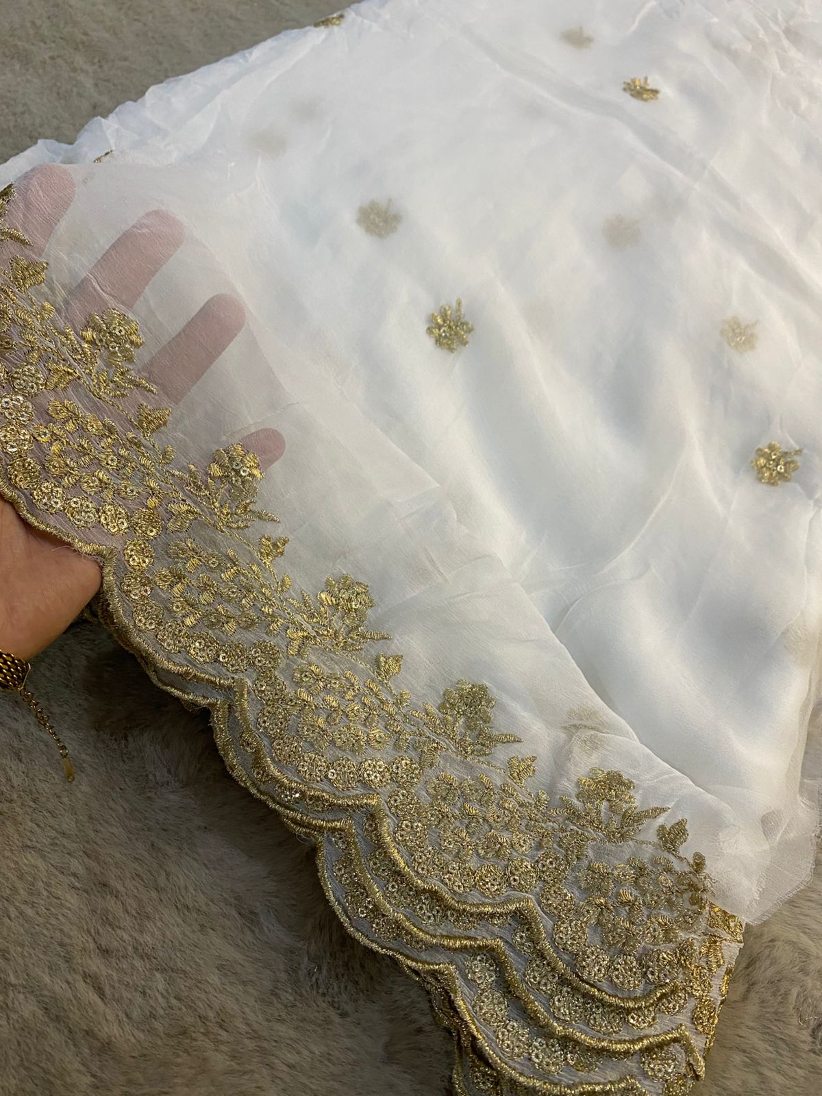 Elevate your look with this premium pure chiffon dupatta, delicately embellished with fine gold tilla and shimmering sequins. Featuring a richly embroidered border and subtle scattered motifs, this dupatta has a lightweight, airy drape and a luxurious finish. Fully dyeable, making it perfect to customize with any outfit—formal, festive, or bridal wear.