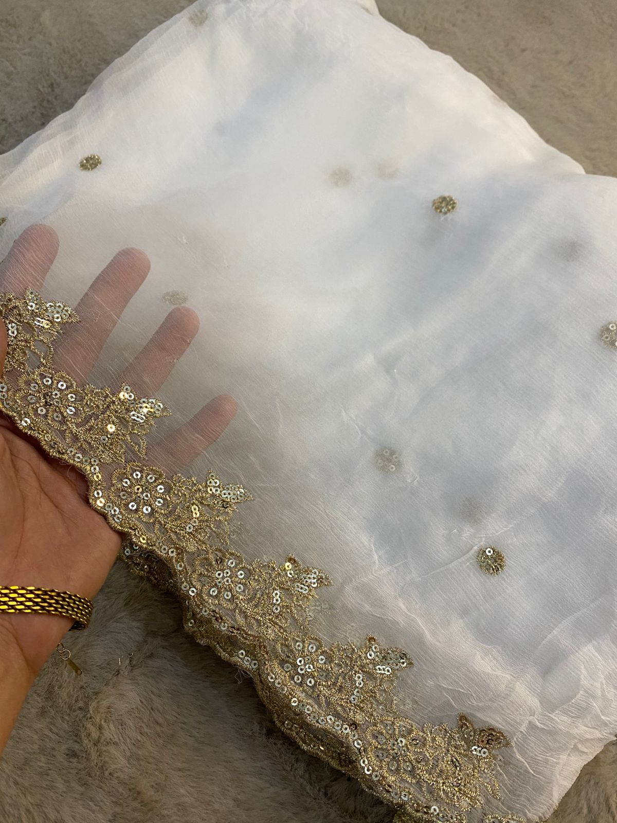 Elevate your look with this premium pure chiffon dupatta, delicately embellished with fine gold tilla and shimmering sequins. Featuring a richly embroidered border and subtle scattered motifs, this dupatta has a lightweight, airy drape and a luxurious finish. Fully dyeable, making it perfect to customize with any outfit—formal, festive, or bridal wear.