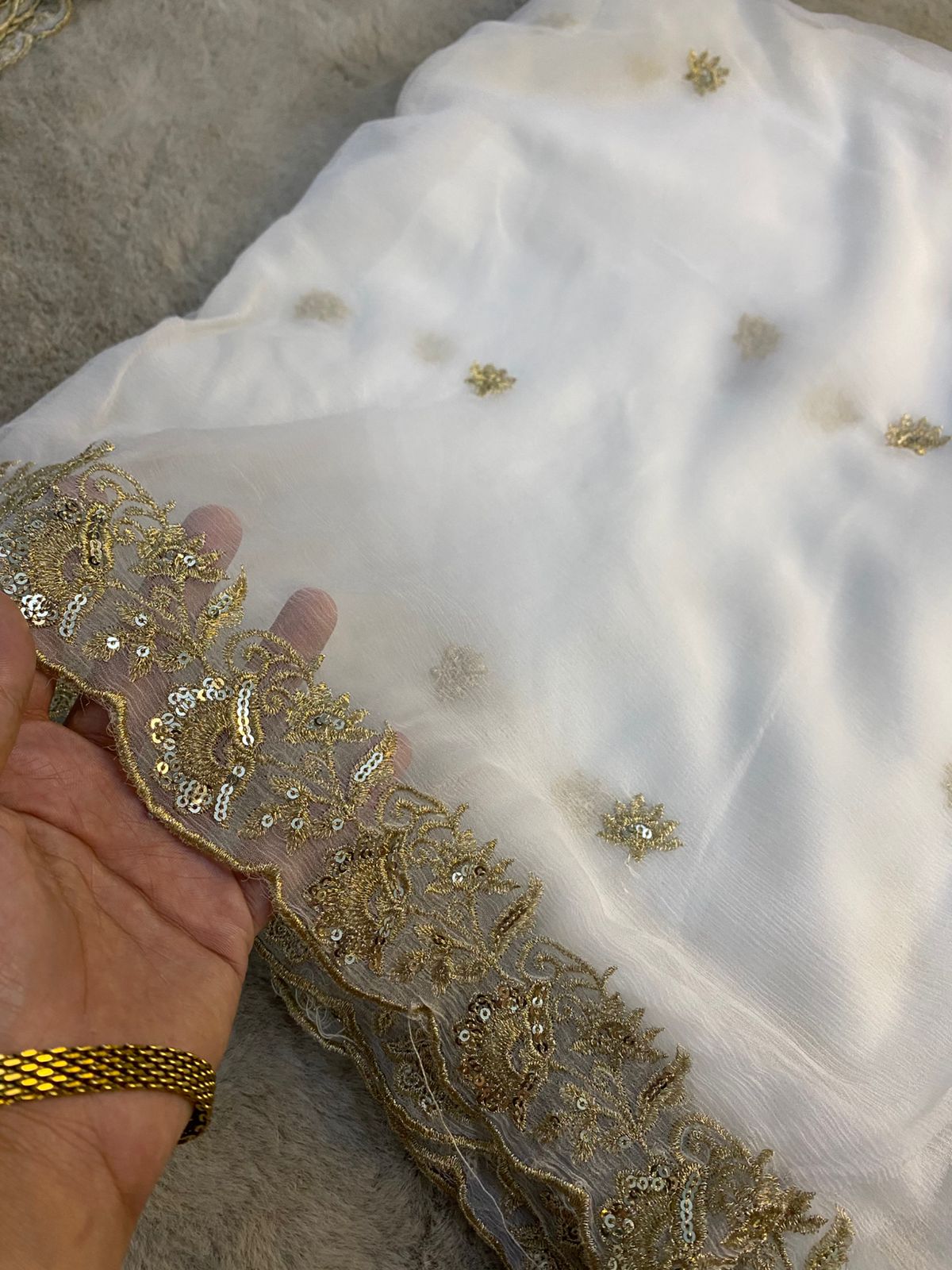 Elevate your look with this premium pure chiffon dupatta, delicately embellished with fine gold tilla and shimmering sequins. Featuring a richly embroidered border and subtle scattered motifs, this dupatta has a lightweight, airy drape and a luxurious finish. Fully dyeable, making it perfect to customize with any outfit—formal, festive, or bridal wear.