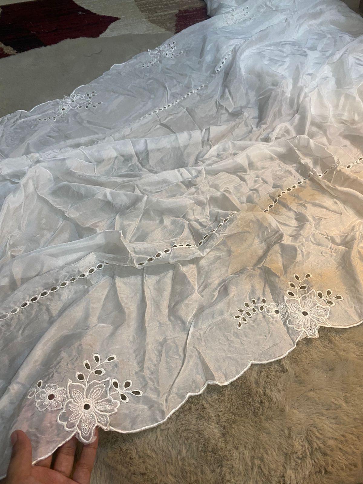 The dupatta features a beautifully detailed embroidered cutwork border with delicate scalloped edging, adding a refined and feminine touch. Its sheer texture and smooth finish make it ideal for pairing with salwar suits, lehengas, or kurtas.