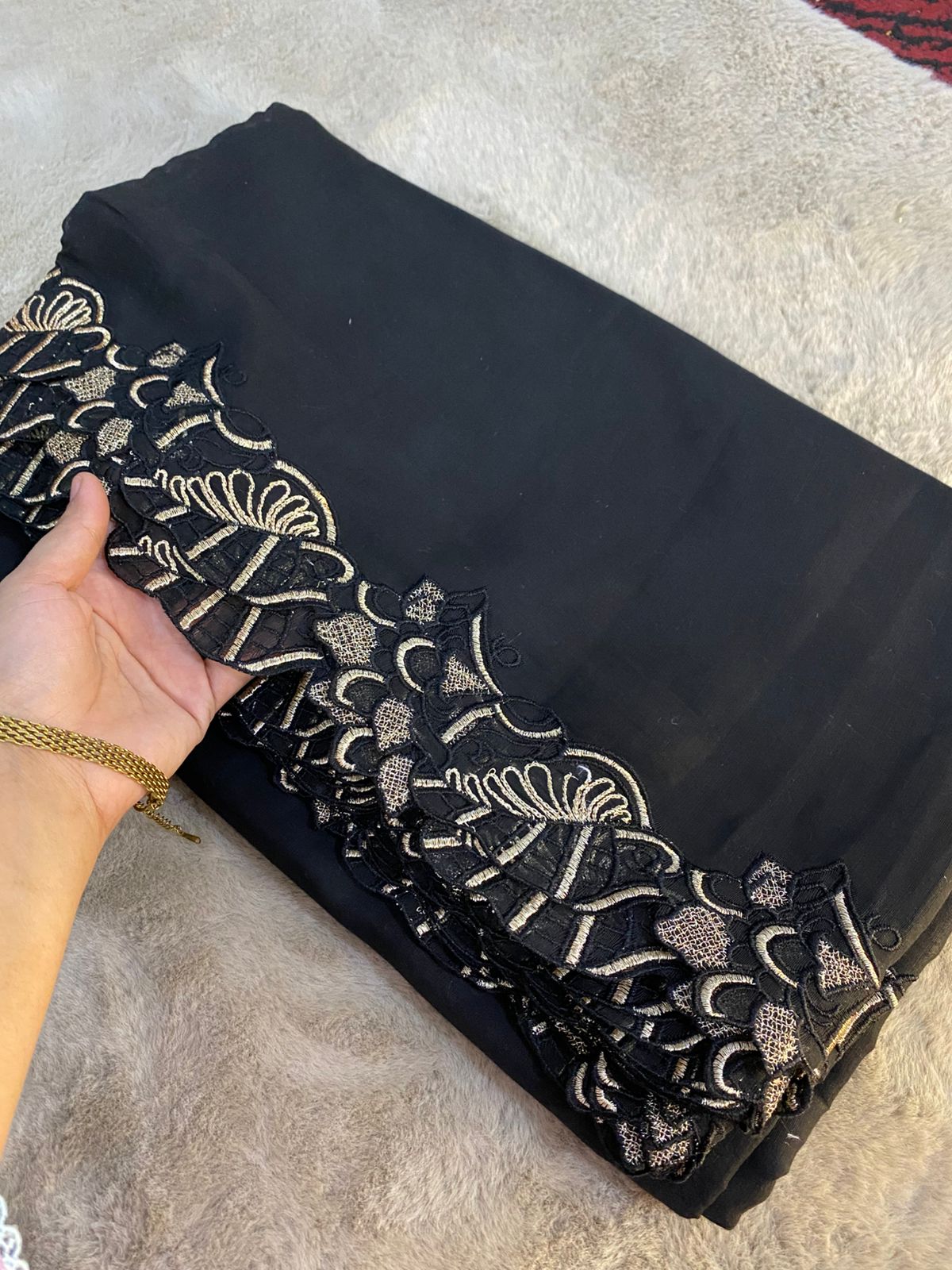 Design: Floral embroidered border with subtle embroidered lines