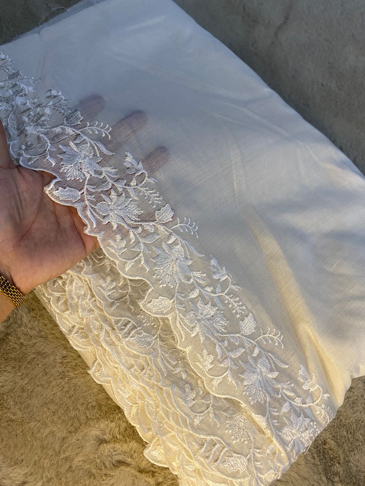 Elegant voile lawn dupatta featuring delicate black embroidery along the border. The lightweight, breathable fabric drapes beautifully and is perfect for both casual and formal wear. Its dyeable base allows customization to match any outfit or occasion.