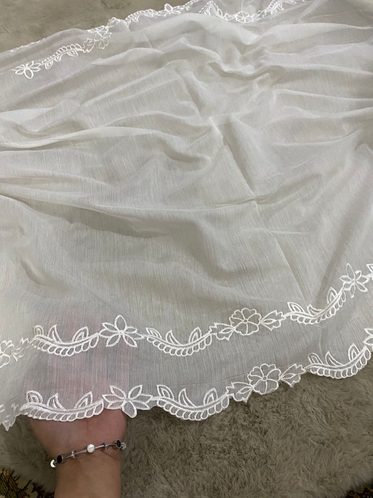 Elegant voile lawn dupatta featuring delicate black embroidery along the border. The lightweight, breathable fabric drapes beautifully and is perfect for both casual and formal wear. Its dyeable base allows customization to match any outfit or occasion.