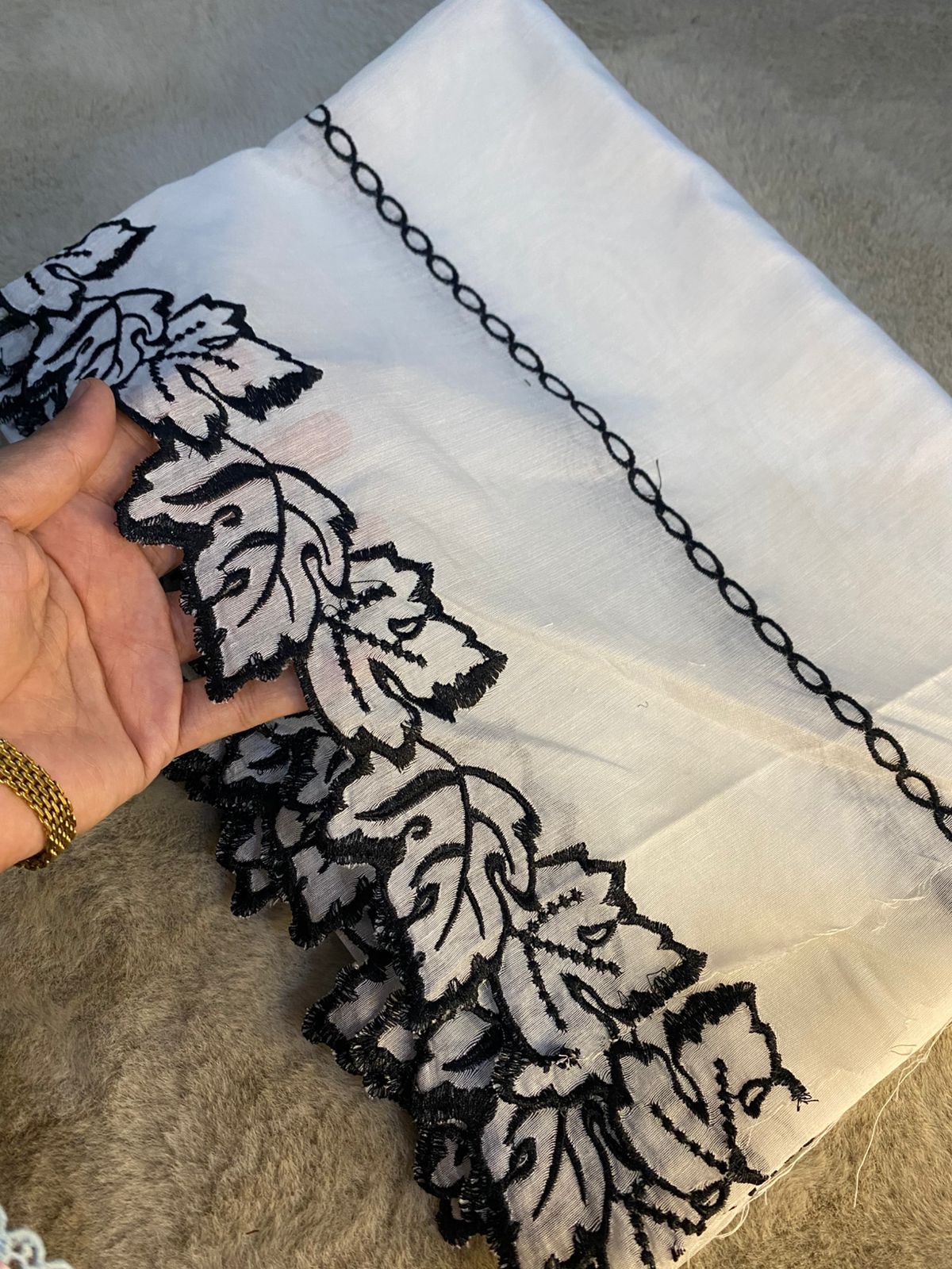 Elegant voile lawn dupatta featuring delicate black embroidery along the border. The lightweight, breathable fabric drapes beautifully and is perfect for both casual and formal wear. Its dyeable base allows customization to match any outfit or occasion.