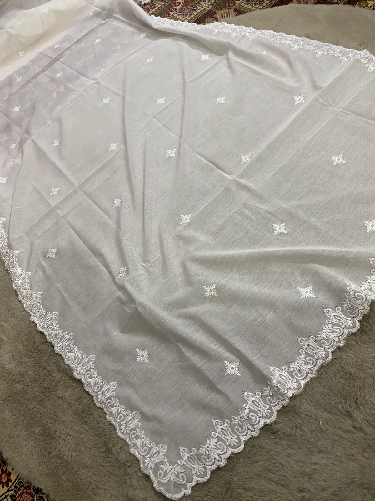 Elevate your outfit with this elegant voile lawn dupatta, featuring delicate four-side scalloped embroidery for a refined and feminine look. The lightweight and breathable fabric makes it perfect for both casual and formal wear.